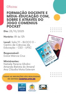 O segundo evento é o workshop “Formação Docente e Mídia-Educação com, sobre e através do Jogo Comenius Pocket”, que ocorrerá no dia 23 de outubro de 2025, também das 8h às 12h.