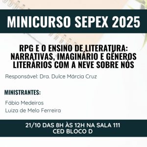 O primeiro é o minicurso “RPG e o Ensino de Literatura: narrativas, imaginário e gêneros literários com a Neve Sobre Nós”, agendado para o dia 21 de outubro de 2025, das 8h às 12h.