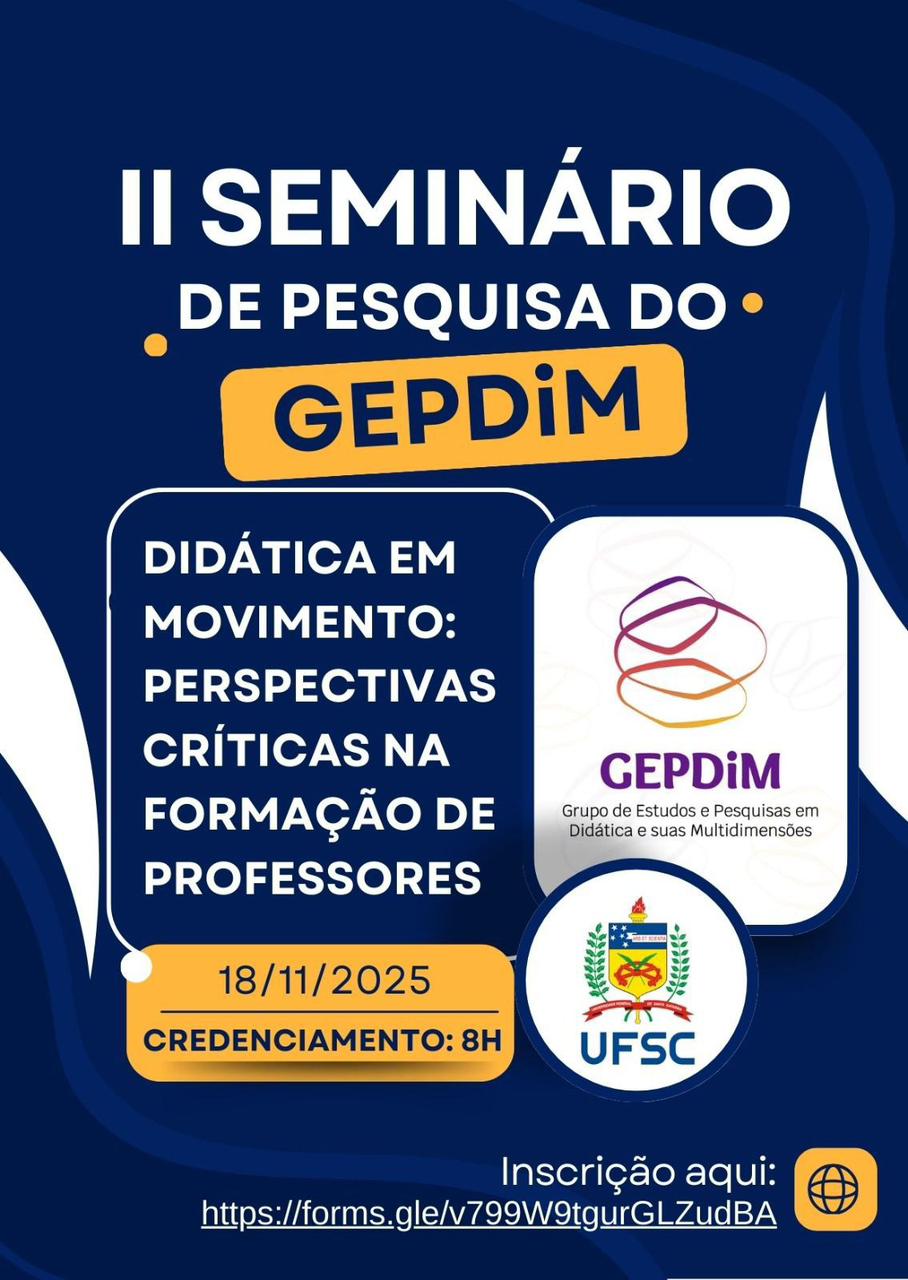 O II Seminário de Pesquisa do GEPDiM, coordenado pela Professora Jilvania Lima dos Santos Bazzo (MEN/CED), configura-se como um espaço privilegiado de interlocução e aprofundamento teórico, metodológico e político das investigações desenvolvidas pelo Grupo, reafirmando o compromisso coletivo com a produção do conhecimento científico, filosófico e artístico sobre a Didática em suas multidimensões. O encontro busca agenciar o diálogo entre pesquisadores, docentes e estudantes, fortalecendo a reflexão crítica acerca da educação básica, da formação docente e das práticas pedagógicas.