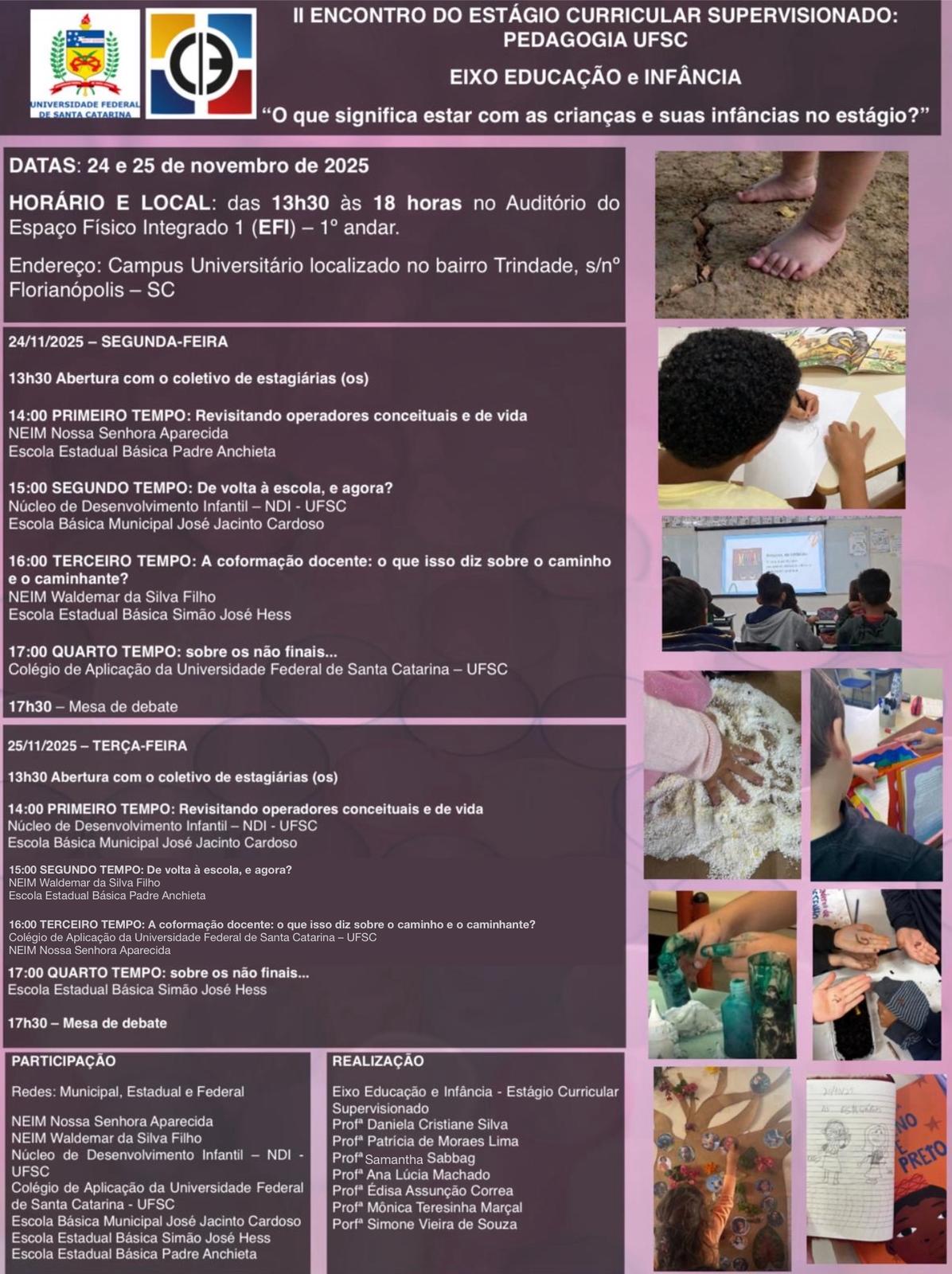O Departamento de Metodologia de Ensino (MEN/CED/UFSC) convida toda a comunidade acadêmica para participar do II Encontro do Estágio Curricular Supervisionado – O que significa estar com as crianças e suas infâncias no estágio?